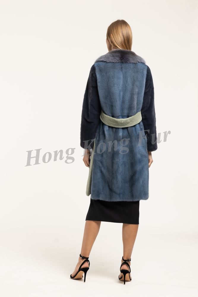 DK GREY F. MINK COAT WITH GREY BLUE F. MINK BACK WITH DYED PIOMBO BLUE SABLE NOTCH COLLAR + LT KAHKI SH. MINK BACK BELT/ SIDE SLITS