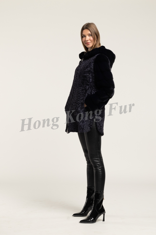 NAVY KARAKUL JACKET WITH N195 NAVY F. MINK HALF SKIN HOR. SLEEVE/HOOD/ZIP FRONT
