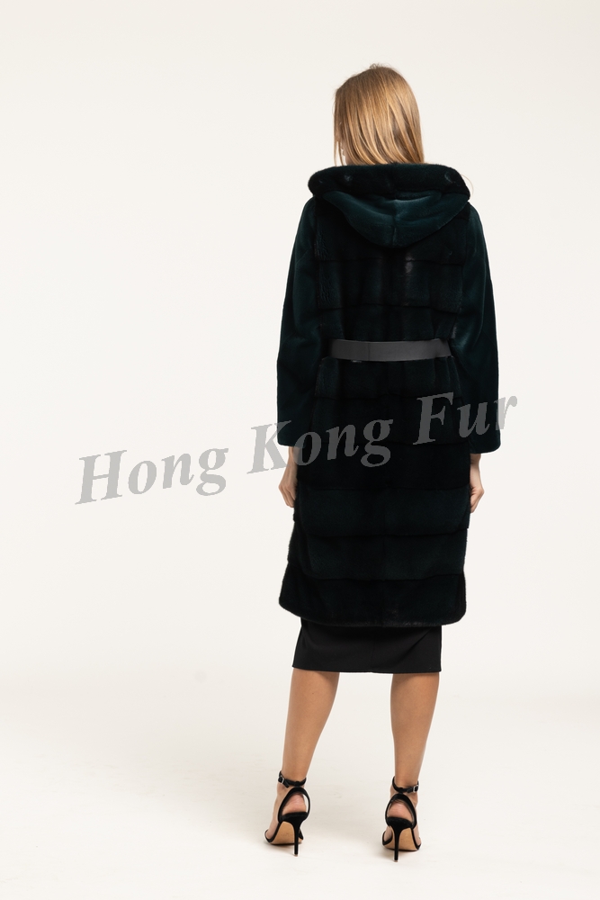 PETR GREEN FEMALE MINK HALF SKIN HOR. COAT WITH SHEARED MINK SLEEVES/HOOD/LEATHER BELT