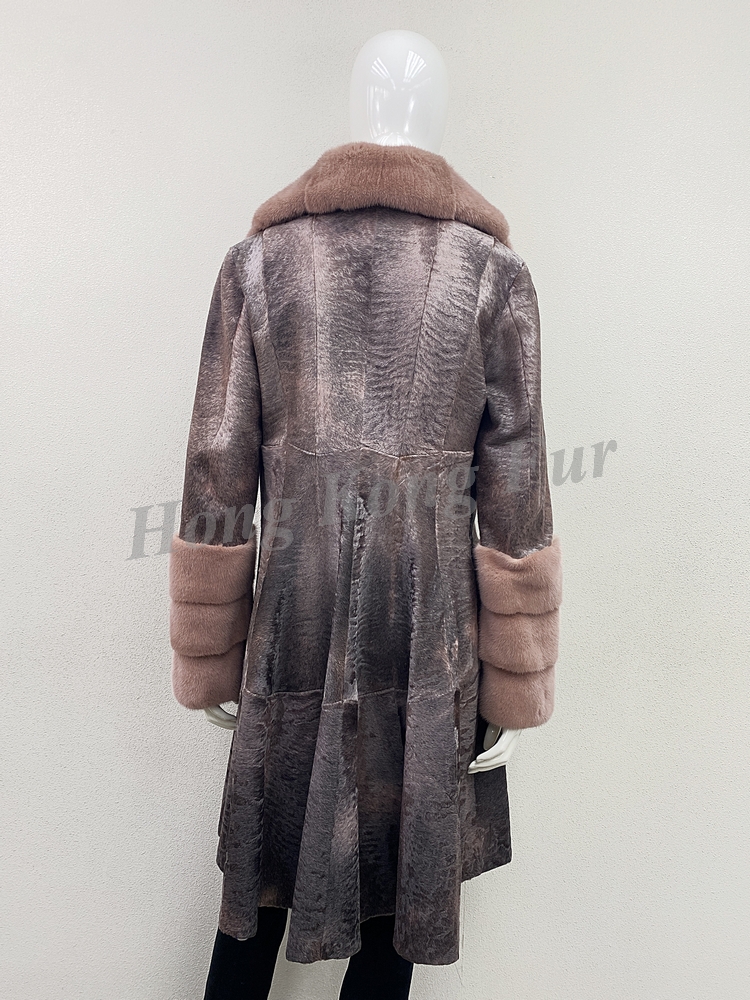 CORAL RUSSIAN BROADTAIL JACKET WITH CORAL FEMALE MINK HALF SKIN HOR. NOTCH COLLAR